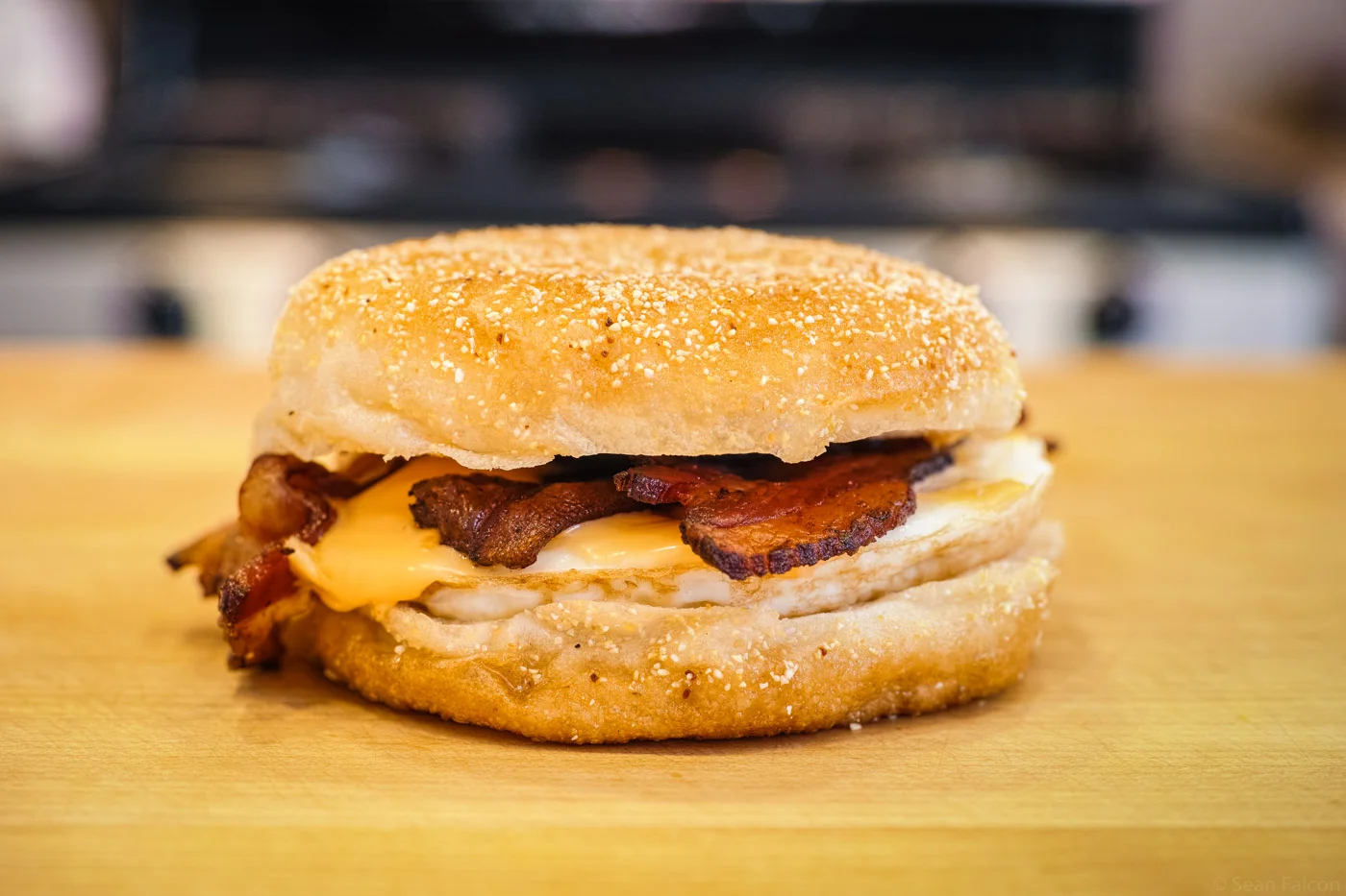 Nothing says Easter Sunday like brunch. This sandwich uses local bread and bacon, so yours may differ, but it’ll still be delicious. The bun is from Model Bakery and is their take on an English Muffin. I cooked this in a small nonstick pan just big enough to fit 2 eggs. They’re usually called ‘egg pans’ and if you make a lot of eggs, they’re really useful to have around. They are also the size of a typical bun, so you can use them to easily cook up an egg that is destined for the top of a burger, or in this case: a breakfast sandwich. The eggs are cooked in the pan until the bottom is completely set and the egg itself is cooked about half way up from the bottom of the pan. It’s then finished in the oven to set the top.